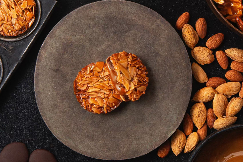 華やかな甘みのアーモンドフロランタンとバターサブレでミルクチョコレートと、さつま芋、バター、生クリームを合わせて炊き上げたスイートポテトキャラメルをサンドしました。
